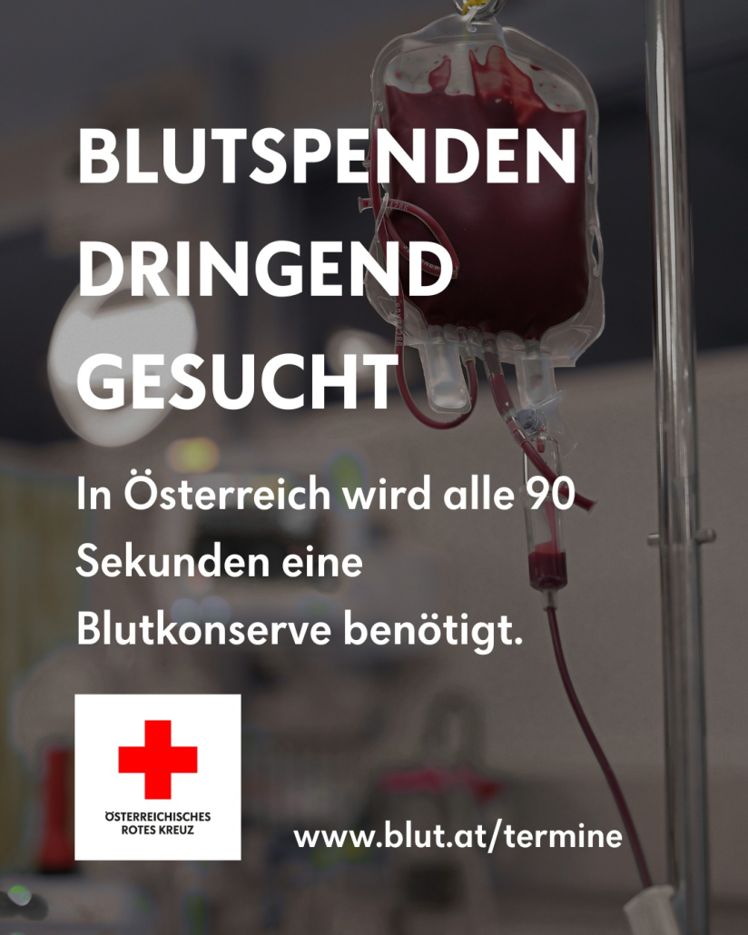 Das Österreichische Rote Kreuz sucht aktuell dringend Blutspenderinnen und Blutspender. Aktuelle Termine sind unter blut.at/termine zu finden.