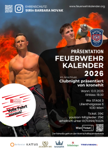 Am 13. November 2025 präsentiert die Gewerkschaft der Berufsfeuerwehr Wien im Stage 3 den heiß begehrten Feuerwehrkalender 2026. Der gesamte Erlös aus Kalender- und Eintrittskartenverkauf kommt dem Mannschaftsspendenfonds zugute, der Kolleginnen und Kollegen der Berufsfeuerwehr Wien in Not sowie deren Hinterbliebene unterstützt.