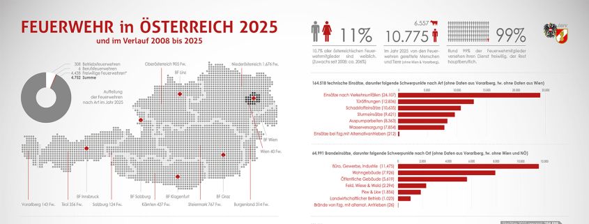 Besonders eindrucksvoll sind die Zahlen der geretteten Menschen und Tiere: Im Jahr 2025 wurden von den österreichischen Feuerwehren 10.775 Menschen und 6.557 Tiere gerettet (ohne Angaben aus Wien und Vorarlberg).