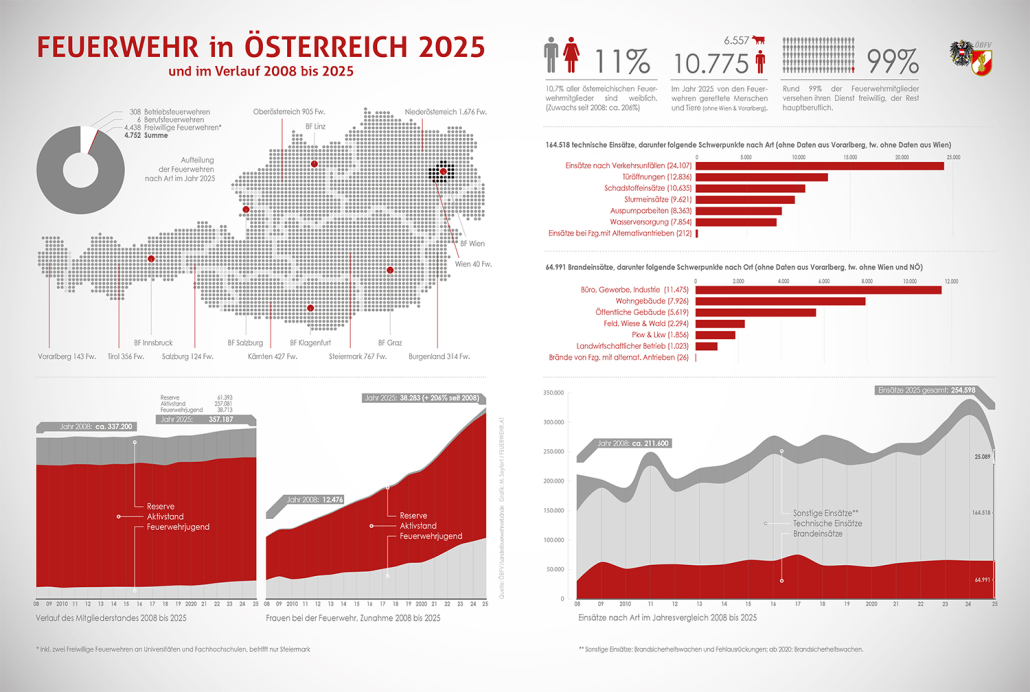 Besonders eindrucksvoll sind die Zahlen der geretteten Menschen und Tiere: Im Jahr 2025 wurden von den österreichischen Feuerwehren 10.775 Menschen und 6.557 Tiere gerettet (ohne Angaben aus Wien und Vorarlberg).