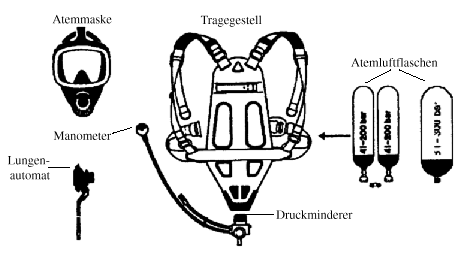 Der Pressluftatmer besteht aus einem Tragegestell mit Stahl- oder Kunststoffflaschen, die mit Druckluft gefüllt sind. Die Flaschen sind mit einer Atemmaske verbunden. Das Gerät macht den Träger so von der Umgebungsluft unabhängig. Seine Einsatzdauer beträgt ca. 30 min. | Der Pressluftatmer | |