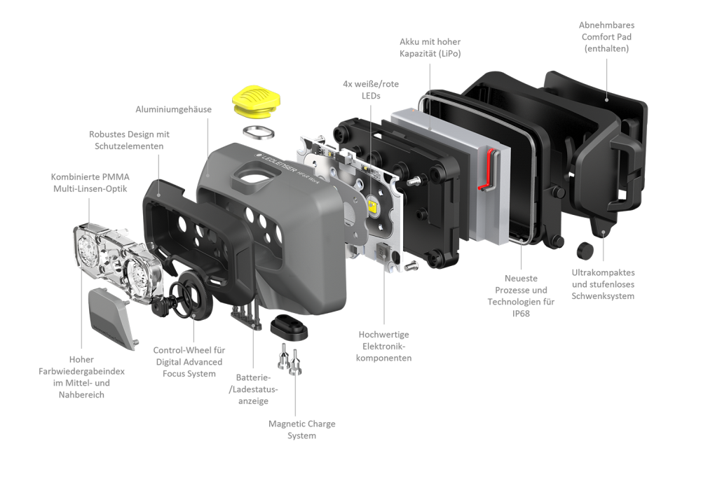 Die Ledlenser HF6R Work ist die schlanke Stirnlampe für den regelmäßigen Einsatz in Industrie und Handwerk. Sie überzeugt mit einem hochwertigen Aluminiumgehäuse sowie mit drei Helligkeitsstufen, rotem Frontlicht und hoher Farbwiedergabe im Nahbereich. Dank unseres zum Patent angemeldeten Digital Advanced Focus Systems ist die HF6R Work nahezu stufenlos fokussierbar. Per Focus Wheel lässt sich das digitale AFS intuitiv bedienen. Schutzelemente am Frontglas rüsten sie für zahlreiche fordernde Anwendungen – und das dank leistungsstarkem Akku bei mittlerer Lichtintensität für ganze acht Stunden. Der integrierte Akku ist einfach und schnell per Magnetic Charge System aufladbar. Weitere praktische Features sind die Wandhalterung sowie verschiedene Möglichkeiten für die Befestigung an Helmen.